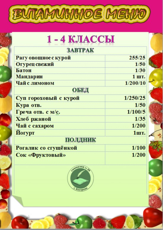 Гимназисту на заметку Витамины. Фрукты, овощи, салаты, фруктовые соки - все это содержит много витаминов. С этого начинай свой завтрак, обед, ужин. Если хочешь, чтобы твоя кожа не была грубой и сухой, не имела болезненного, бледного цвета, в твой рационе непременно должны входить витамины. И лучше не в драже и в таблетках, а в овощах и фруктах. Витамин А содержится в овощах и фруктах красной или желтой окраски: в моркови, дынях, помидорах, а также в шпинате, щавеле, зеленом горошке, салате, зеленом луке, кроме того, в рыбьем жире, твороге, печенке, яйцах. Продукты, содержащие витамины А, не должны находиться на воздухе, на свету. Овощи не моют горячей водой. Витамин В- в дрожжах, печенке, грибах, темном тесте. Витамин В- в дрожжах, печенке, грибах, молоке, сыре, овощах. Запомни, что сода уничтожает витамины, поэтому не смягчай воду таким образом. Витамины могут растворяться в воде, поэтому вари овощи в небольшом количестве воды. Витамины В разлагается на свету. Витамин С - в картофеле, квашеной капусте, лимоне, боярышнике, шиповнике. Витамин С растворяется в воде. Продукты, содержащие витамин С, следует готовить перед едой и сразу же подавать на стол. Несколько слов о шиповнике. Шиповник не так давно стал известен как продукт, самый богатый витамином С. Поэтому осенью советую приготовить наливку из шиповника на всю зиму. Боярышник также содержит витамины А, В, Д. Витамины - Д в яйцах, масле, сметане, молоке, грибах, рыбьем жире. Витамин Д не поддается внешним влияниям, поэтому любые кулинарные фокусы не смогут нейтрализовать его.